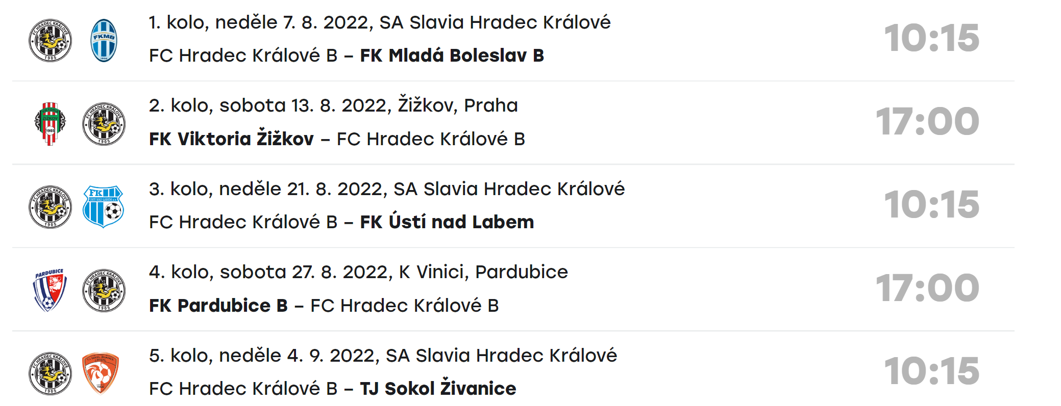 Votroci se v neděli 7. srpna střetnou v 10:15 na hradecké Slavii s rezervou Mladé Boleslavi. První venkovní duel je čeká o týden později v Praze na Žižkově a ještě v průběhu srpna stihnou Hradečtí další dvě klání, v domácím prostředí s Ústím nad Labem a 27. srpna je čeká derby v Pardubicích.