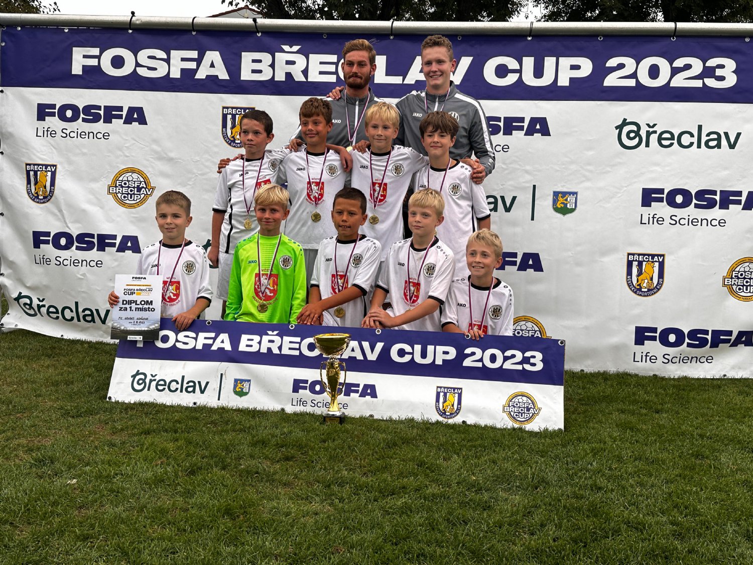 V sobotu 7.10. jsme zajeli až do daleké Břeclavi na kvalitně obsazený Břeclav Cup. Na turnaj jsme se velice těšili, jelikož nám nabídl konfrontaci jak s českou, tak s moravskou špičkou, se kterou se jen tak, během sezony, nepotkáme. Turnaj byl uspořádán do dvou skupin po 8 týmech a následoval jeden zápas o umístění s týmem z druhé skupiny, jenž se umístil na stejné příčce. V základní skupině nás tedy čekalo 7 kvalitních zápasů. Do turnaje jsme vstoupili utkáním proti domácím, se kterými jsme si výsledkově i herně poradili. Na klucích byla vidět velká chuť a aktivita, za což jsme byli rádi. Další zápas, proti Baníku Ostrava, už byl více určující. Naši kluci se však soupeře nezalekli, a i přes obdržený první gól nepřestali hrát a dalo by se říci, že jsme "ubojovali" další vítězství. Následovalo utkání s Opavou, které hodnotíme z celého turnaje jako nejméně povedené. I když to ,při pohledu na výsledek, nevypadá, prakticky jsme se naší kombinací nedostali na soupeřovu půlku a vítězství nebylo vůbec zasloužené. Naštěstí nám byla věnována obědová pauza, a my jsme u párku s chlebem, jenž nám byl pořadateli přidělen, mohli na špatný výkon zapomenout. Po obědě nás čekali ještě 4 náročné zápasy ve skupině (Mistelbach, Sparta Praha, Slovácko, Dosta Bystrc). My jsme všechny výsledkově, ale musíme uznat, že i herně zvládli. V některých pasážích jsme se dostávali i do opravdu fotbalových kombinací, což těšilo nejen nás, ale i přítomné rodiče, kteří s námi tu štreku absolvovali. Jelikož jsme ve skupině neztratili ani bod, postoupili jsme z 1. místa do finále, ve kterém nás vyzvala olomoucká Sigma. Ve finále jsme si triumf nenechali utéct a vyhráli jsme, po dobrém výkonu, 3:0. Turnaj jsme tak bez ztráty bodu ovládli! Gratulujeme Nikolasu Šulcovi k nejlepšímu hráči turnaje, děkujeme pořadatelům za opravdu pěkný turnaj, soupeřům děkujeme za pěkné zápasy a velký dík patří rodičům za neustálou podporu!