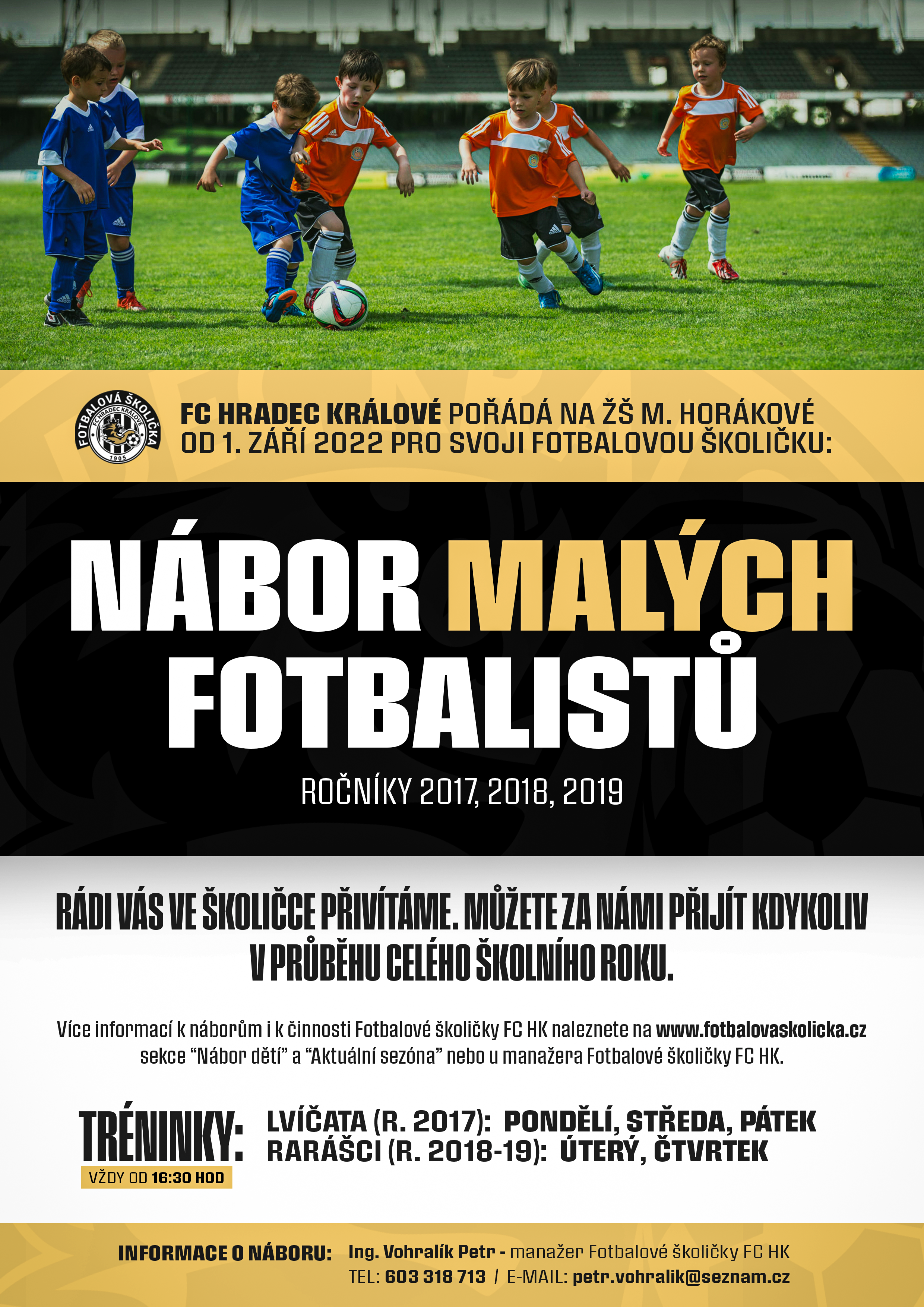Veškeré informace k činnosti Fotbalové školičky FC Hradec Králové naleznete na jejích internetových stránkách – v sekcích Nábor dětí a Aktuální sezóna. Ve školičce budete vždy srdečně přivítáni, nábor probíhá po celý školní rok, takže se nikdy nemusíte bát přijít. Lvíčata (ročník 2017) trénují v pondělí, středu a pátek. Rarášci (ročníky 2018-19) pak v úterý a ve čtvrtek. Veškeré vaše dotazy rád zodpoví manažer Fotbalové školičky, Ing. Petr Vohralík (603 318 713, petr.vohralik@seznam.cz).