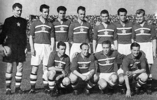FOTO: MS Švýcarsko 1954 před utkáním proti Uruguay (0:2), horní řada zleva Reimann, Šafránek, Pažický, Hledík, Malatínský, Novák, Benedikovič, dolní řada zleva: Pešek, Hlaváček, Trnka, Hemele