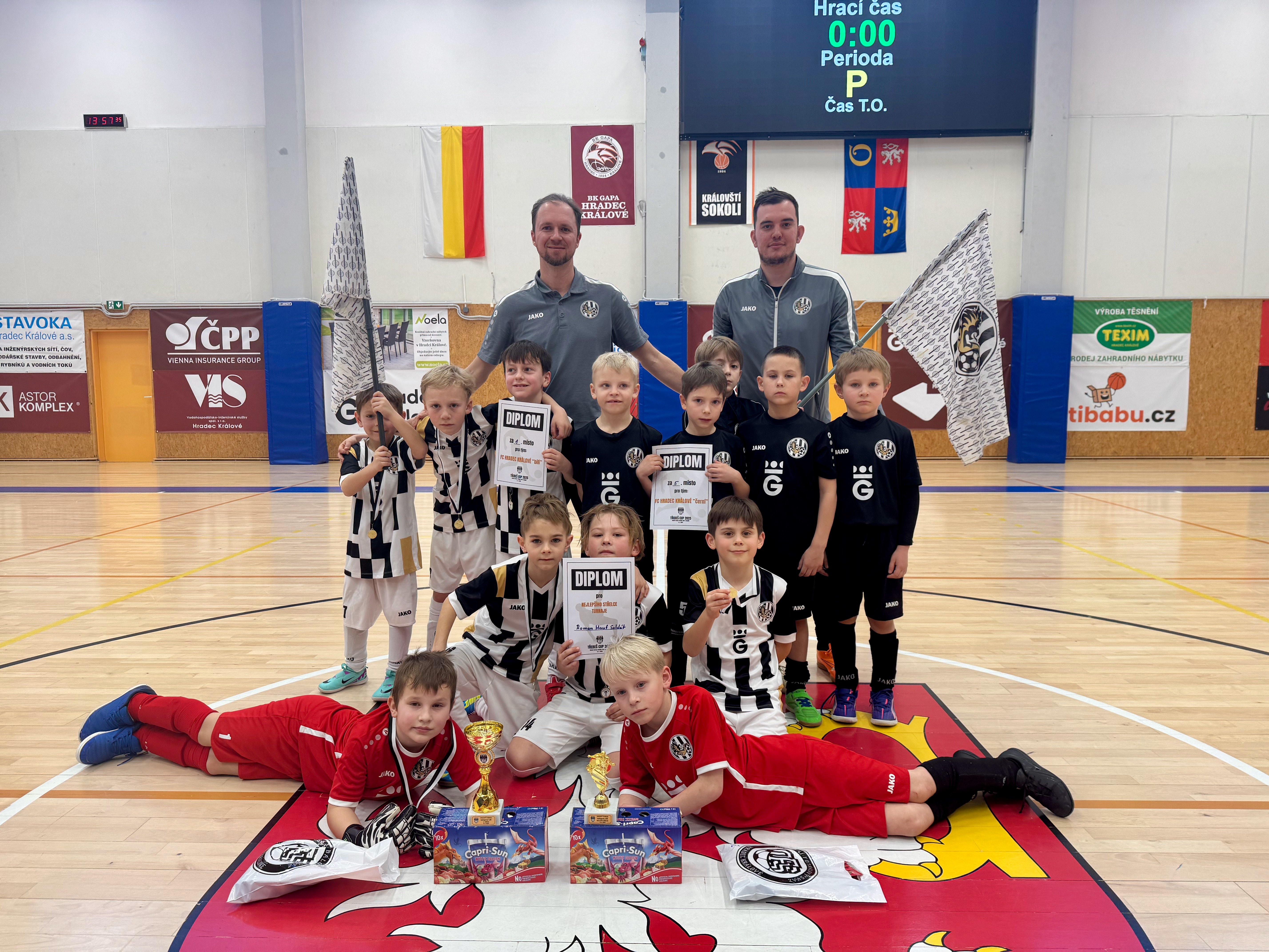 Sobotní turnaj v třebešské hale pro nás dopadl úspěchem. Úspěchem, který si naši kluci za celou halovou sezónu zasloužili. Nastoupili jsme se dvěma týmy a do plného počtu nám celkem chyběli 4 hráči. Celkově 50x jsme si zakřičeli góóól. Nejprve jsme si zahráli proti sobě, kdy bílý tým tentokrát černým nedal žádnou šanci a vyhrál vysoko 13:0. Tento výsledek byl v celkovém součtu velmi důležitý.