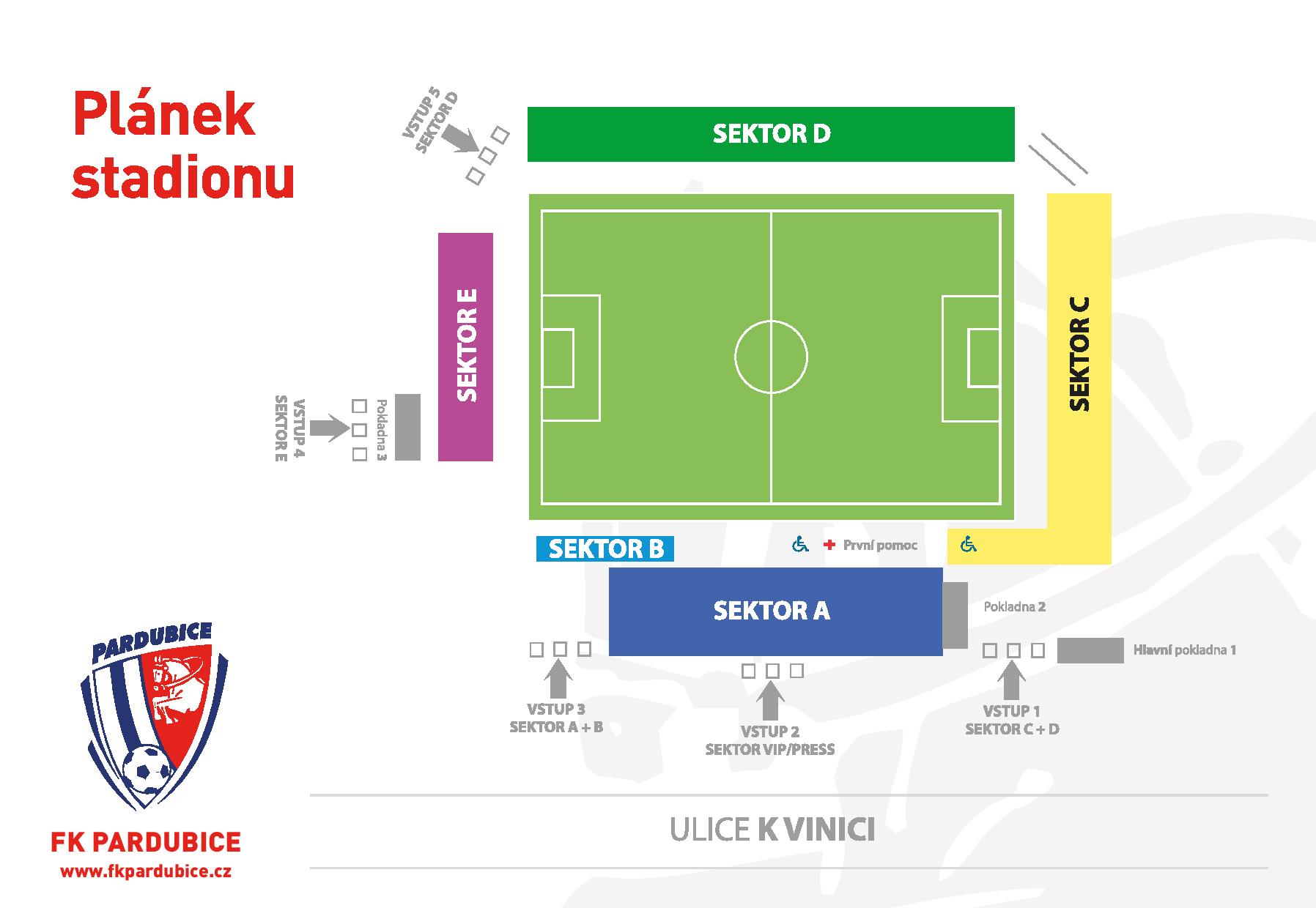 - fanouškům FC Hradec Králové je určen sektor sektoru E (za brankou vlevo z pohledu hlavní tribuny) a sektor B (montovaná tribuna pod hl. tribunou vedle střídačky FC Hradec Králové)