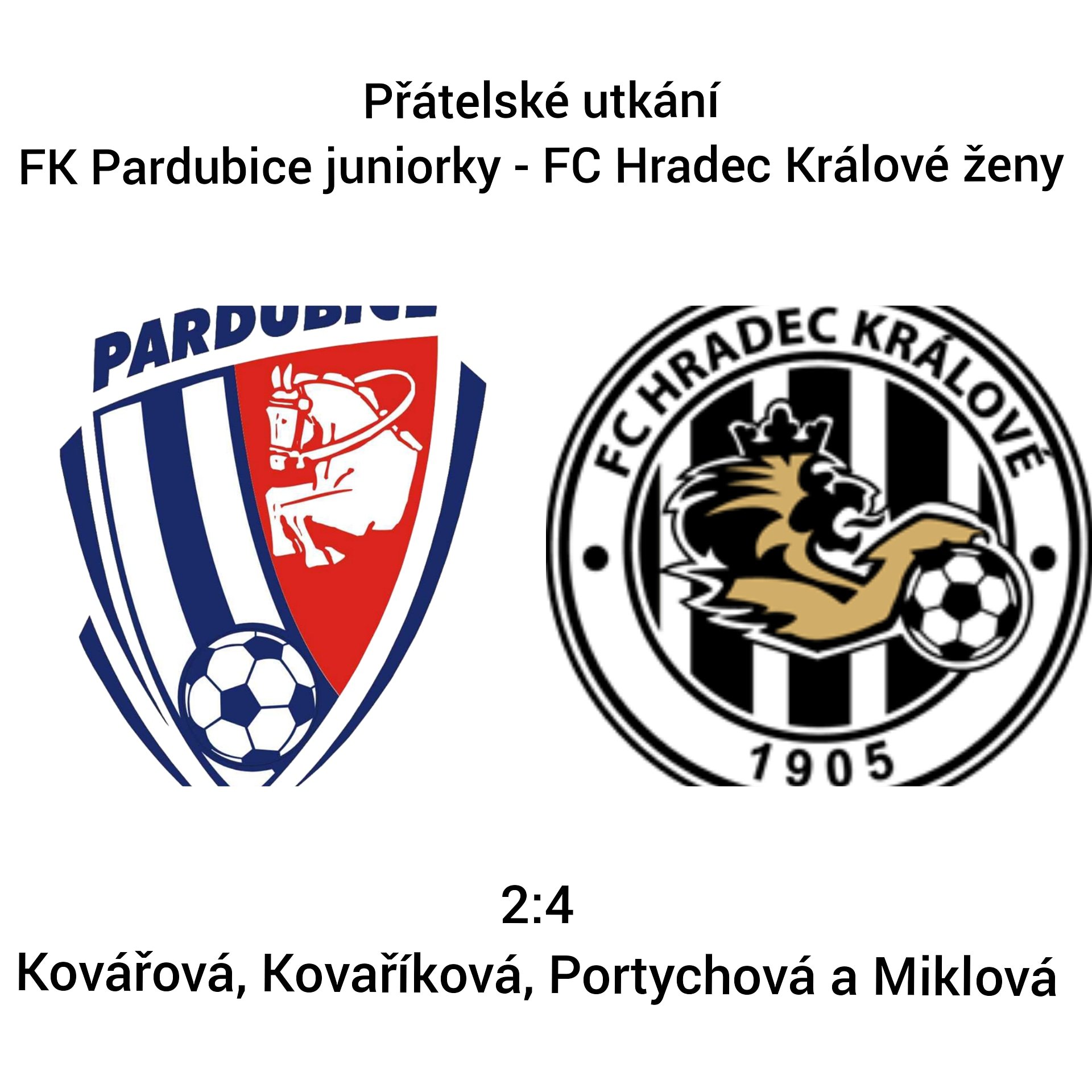 V neděli 6.6.2021 se od 16 hodin utkal tým žen FC Hradec Králové s týmem juniorek FK Pardubice na hřišti v Dolíčku. Za úmorného vedra byla na týmu žen vidět dlouhá herní pauza a první třetina zápasu (hrálo se po dohodě trenérů 3x30 minut) byla herně špatná. O přestávce přišla důrazná domluva a ve druhé třetině tým pracoval podle přestav trenéra. Postupně se objevovala kombinace, pohyb a náběhy do správných prostorů. Bohužel došlo k několika zraněním a poslední třetina byla i o morálce týmu. FC Hradec Králové ukázal více zkušeností, větší sílu v osobních soubojích a porazil juniorky Pardubic 4:2, góly dala Kovářová, Kovaříková, Portychová a Miklová. Je potřeba vyzdvihnout velmi povedený výkon juniorek soupeře. Tým hrál skvěle technicky a byl lepší v situacích 1 na 1.