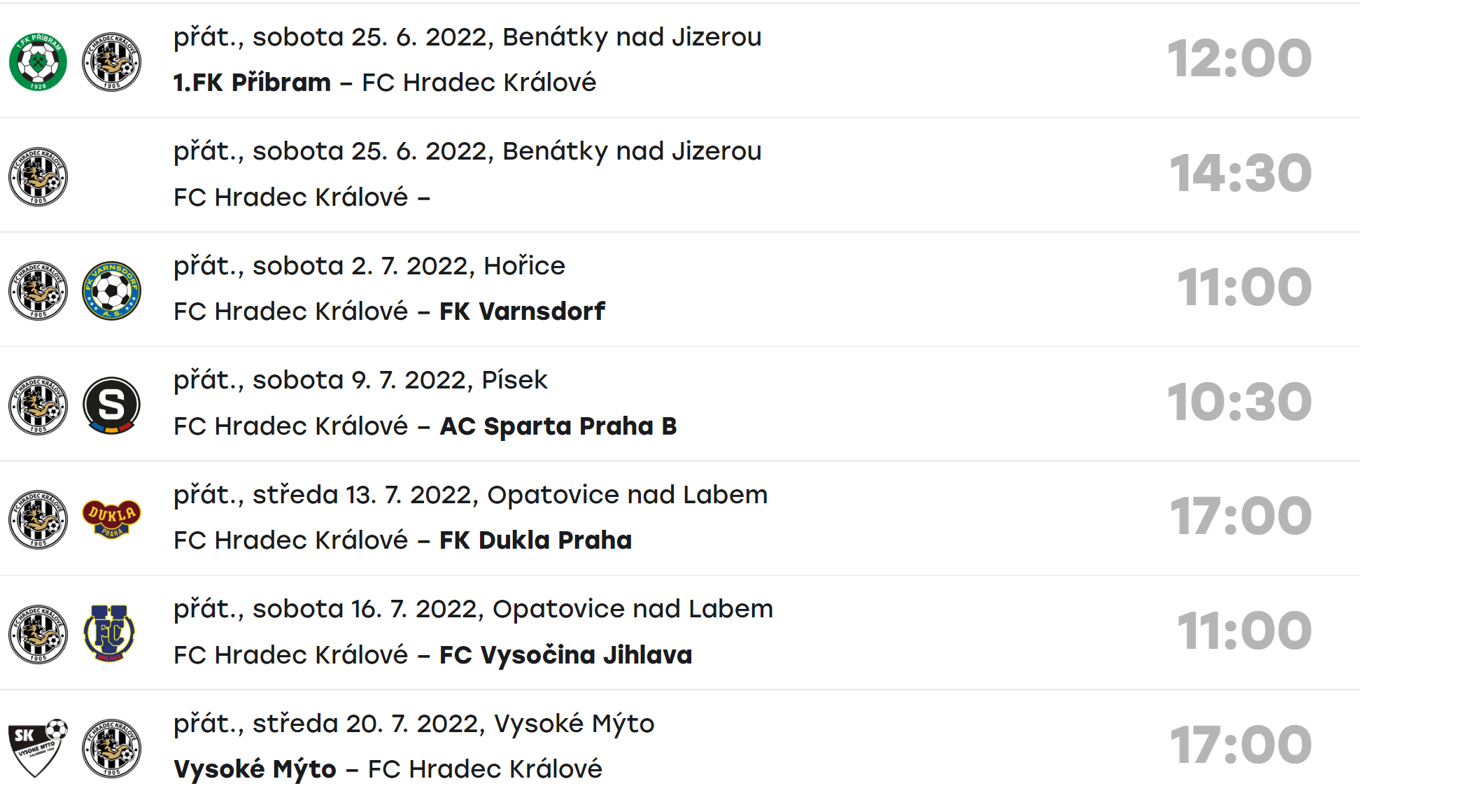 O týden později, přesně 2. července, pak čeká na Hradec souboj s Varnsdorfem v Hořicích. Utkání startuje v 11:00. O dva dny později začíná Votrokům soustředění na tradičním místě v Písku, kde se Východočeši utkají s B týmem pražské Sparty. Střetnutí sehrají v sobotu 9. července od 10:30.