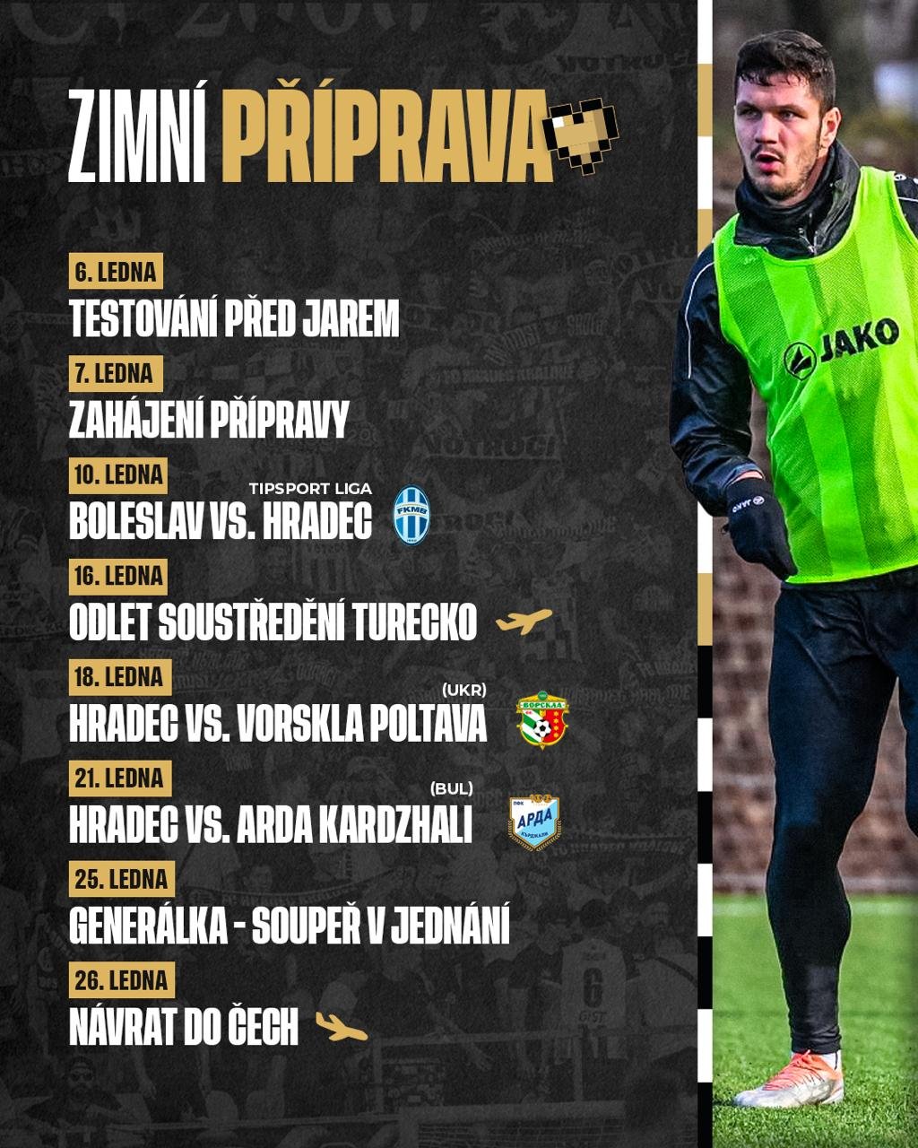 Ve čtvrtek 16. ledna odlétá A-tým Hradce Králové na soustředění do Turecka. V sobotu 18. ledna se zde poměří s celkem z ukrajinské nejvyšší soutěže, soupeřem Východočechů bude Vorskla Poltava. O tři dny později se Votroci utkají s mužstvem z bulharské 1. ligy, svěřence Davida Horejše prověří Arda Kardzhali. V sobotu 25. ledna pak černo-bílý tým čeká generálka před Chance Ligou. Jméno protivníka je zatím součástí jednání.