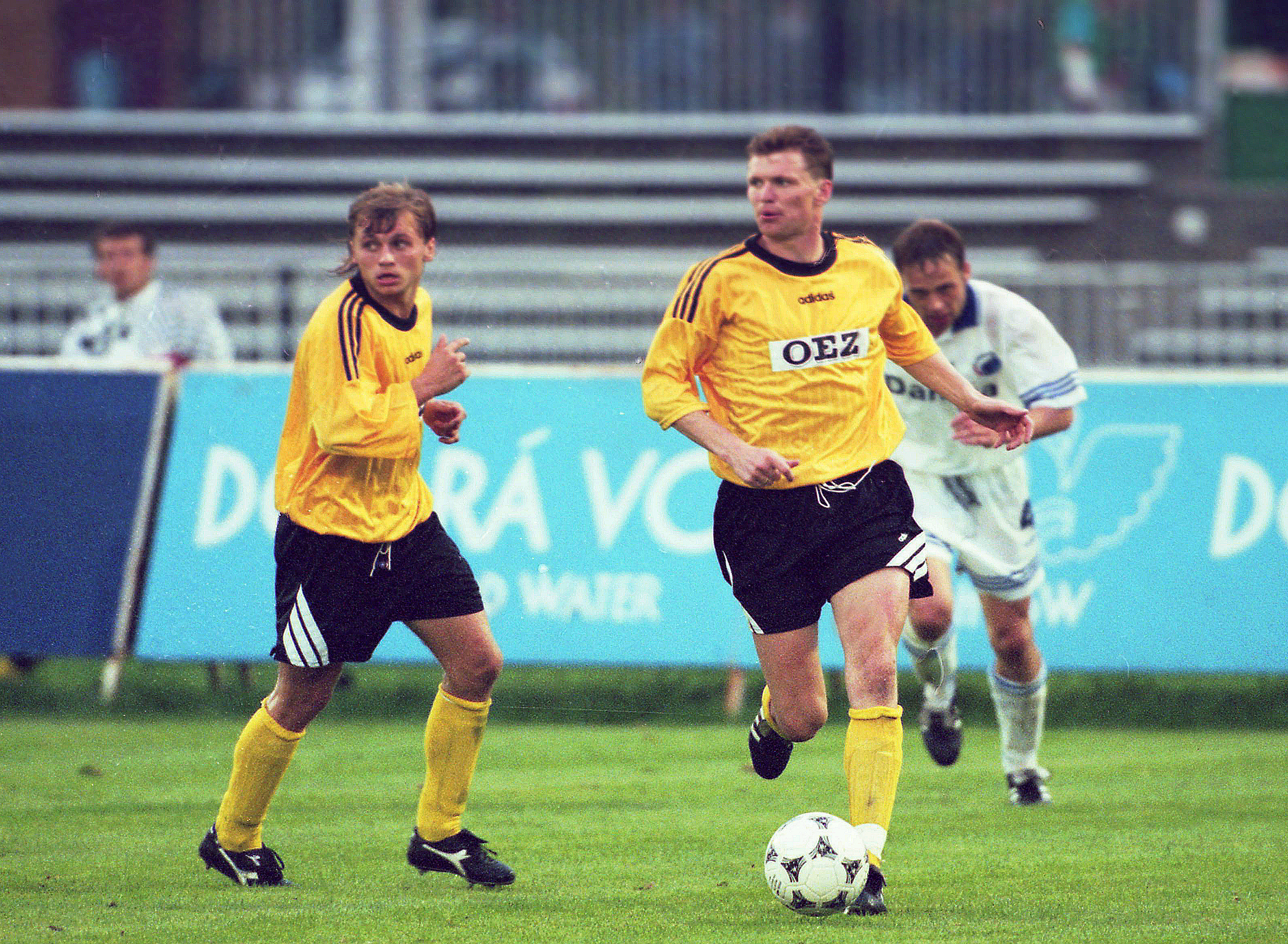 Černobílé barvy převažují dodnes v různých variantách. Na prsou se objevil červený znak Hradce Králové, fotbalový znak FC Hradec a také partneři – FOMA, HBO, FOMEI, KONICA, BENZINA. Na podzim 1995 hráči nastupovali i ve žlutém dresu s nápisem OEZ a v černých trenýrkách a odehráli v něm i zápasy PVP s Kodaní a Dynamem Moskva.