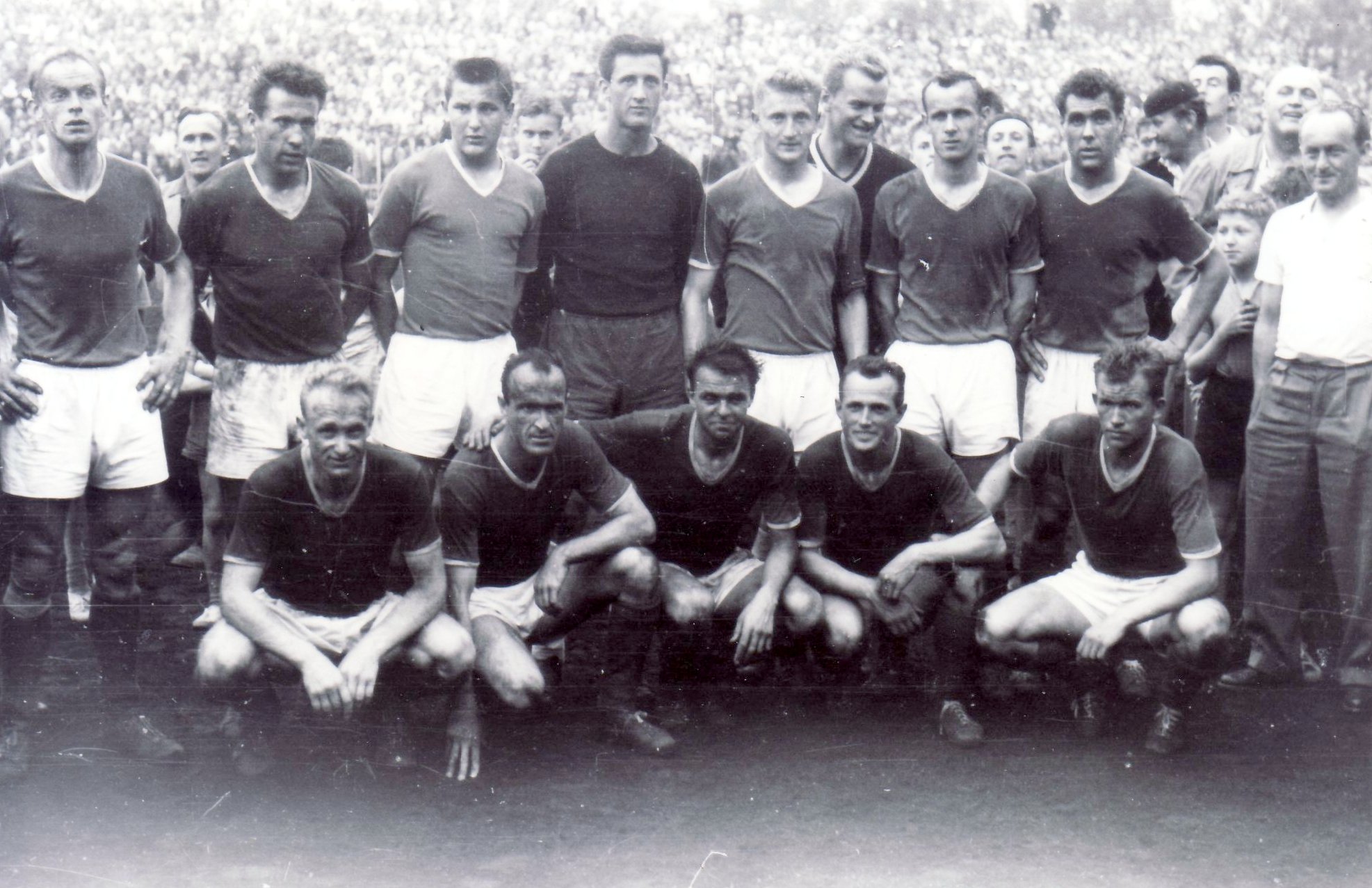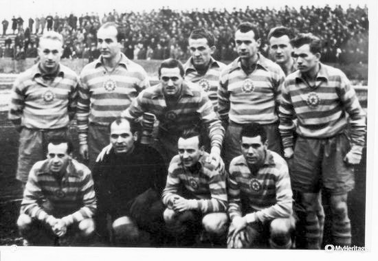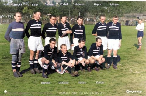 Přišla padesátá léta a změny názvů mužstev, soutěží, nesmyslných nápadů a opatření, a také rozmanitosti dresů. Chvíli byl na prsou okřídlený šíp, později kulatý znak s hvězdou. V roce 1955 postoupil Hradec poprvé do nejvyšší soutěže, ale jaké jsou barvy dresu na fotografii, si nevzpomněl ani Zdeněk Krejčí, který v něm hrál. Pomůže někdo z pamětníků?