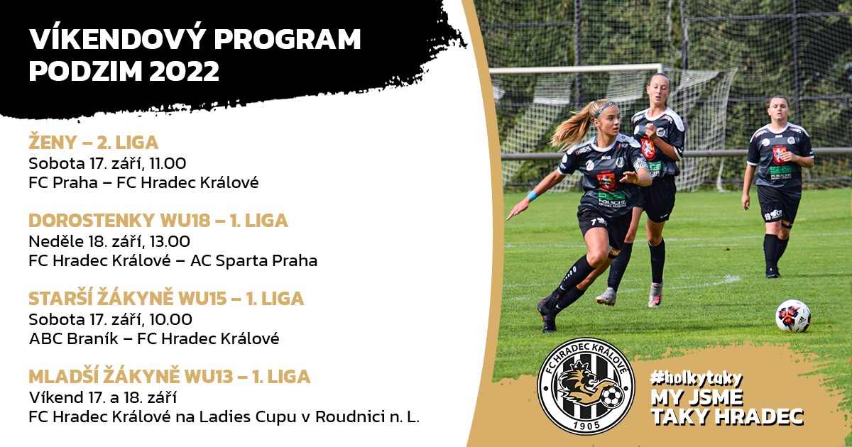 O tomto víkendu se v domácím prostředí na Novém Hradci představí pouze dorostenky, které v atraktivním souboji přivítají v neděli od 13 hodin pražskou Spartu. Naopak do hlavního města vyrážejí ženy, které v sobotu dopoledne nastoupí na hřišti FC Praha, a také starší žákyně, jež nastoupí k předehrávce 10. kola na hřišti Braníku. Mladší žákyně cestují na dvoudenní turnaj Ladies Cup do Roudnice nad Labem.