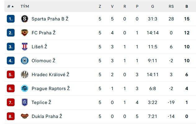 Výsledky - 5. kolo: FC Praha - Sparta Praha B 0:9, Teplice - Líšeň 0:5, Prague Raptors - Dukla Praha 4:1.