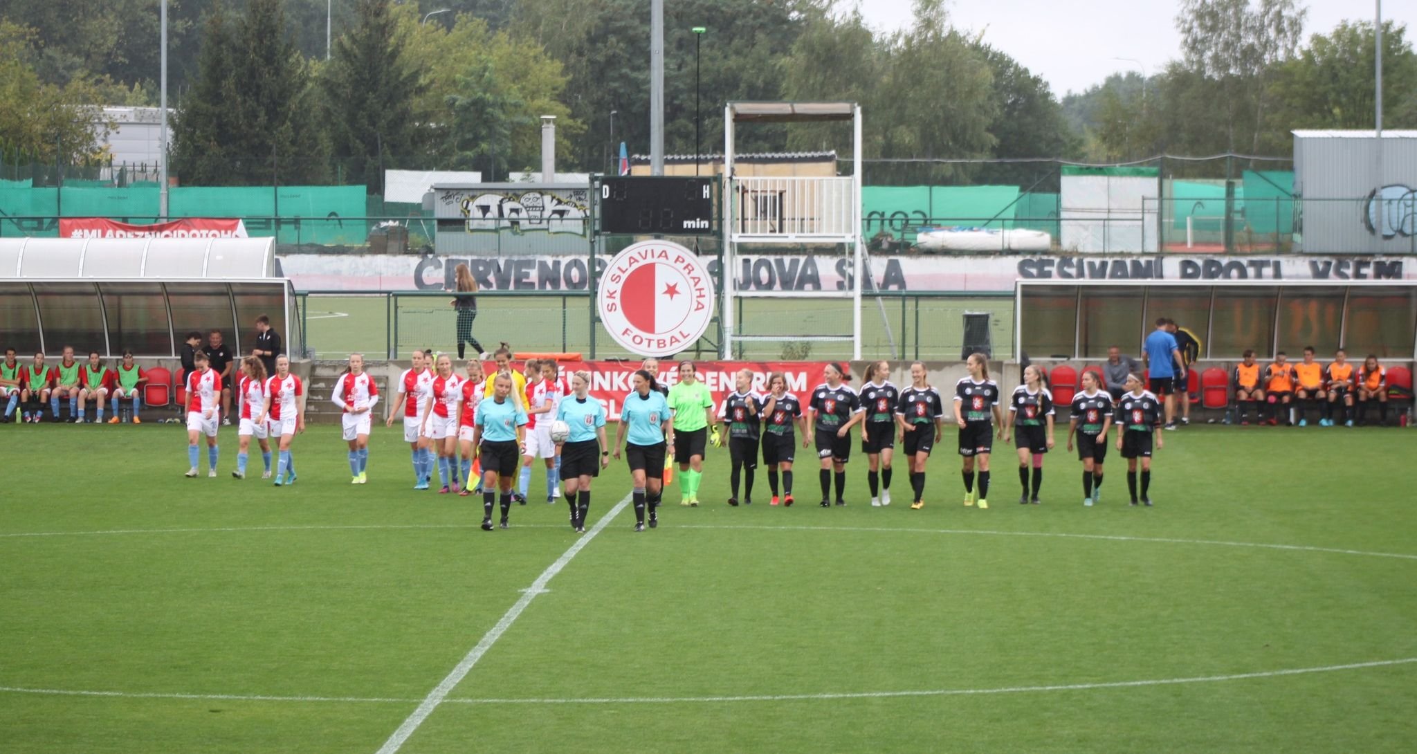 Po domácí prohře s Lokomotivou Brno nás v druhém kole čekal další těžký soupeř a to Slavia Praha, která začala ligu vysokou výhrou nad Teplicemi (19:0). A tak jsme hráčky vyzývaly k tomu, aby soupeři co nejvíce znepříjemnily každou chvilku v zápase a zkusily si utkání užít a hlavně si zahrály fotbal. Momentálně se takto kvalitním celkům herně nevyrovnáme, ale dnešních 60.minut s výsledkem 1:1 ukázalo, že se holky opravdu snaží plnit vše a hrály na své maximum. S omlazeným a nesehraným týmem to jde pomalu, posun je však znát. V první půli jsme se překvapivě ujali vedení, kdy se Julče Černé podařilo přelobovat gólmanku. A vedení mohlo být při větším štěstí i dvoubrankové(štěstí jsme měli opravdu hodně