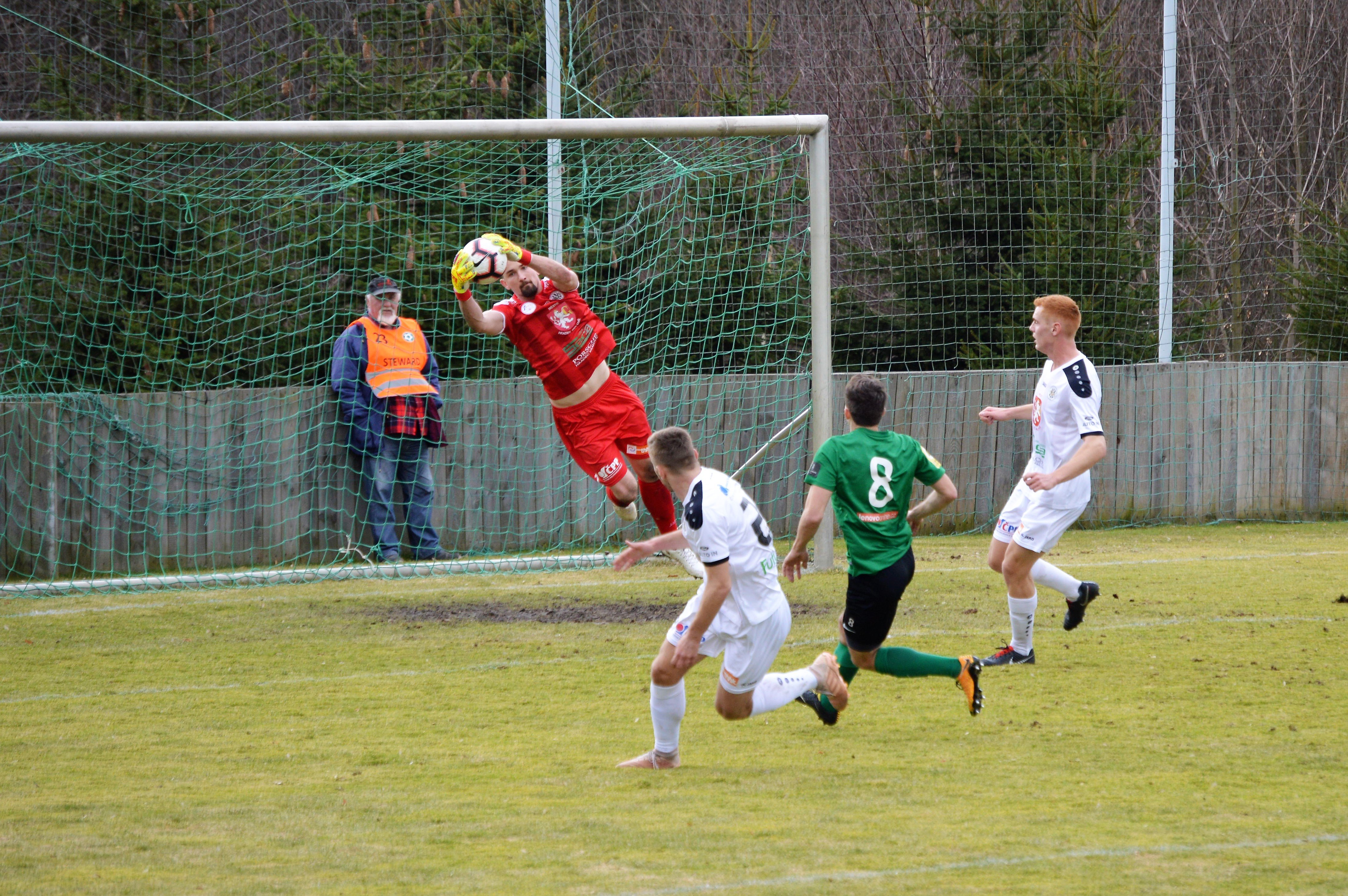 Domácí pak měli převahu, šance, které si vytvořili, ale pochytal vynikající Patrik Vízek. Hradečtí mezitím hrozili z brejků, právě po Vízkově výkopu šel sám na gólmana soupeře Dominik Bičiště, z úhlu však trefil tyč. Hradecký brankář střelce soupeře doslova deptal, třeba Matěj Polidar na něm ztroskotal hned několikrát.