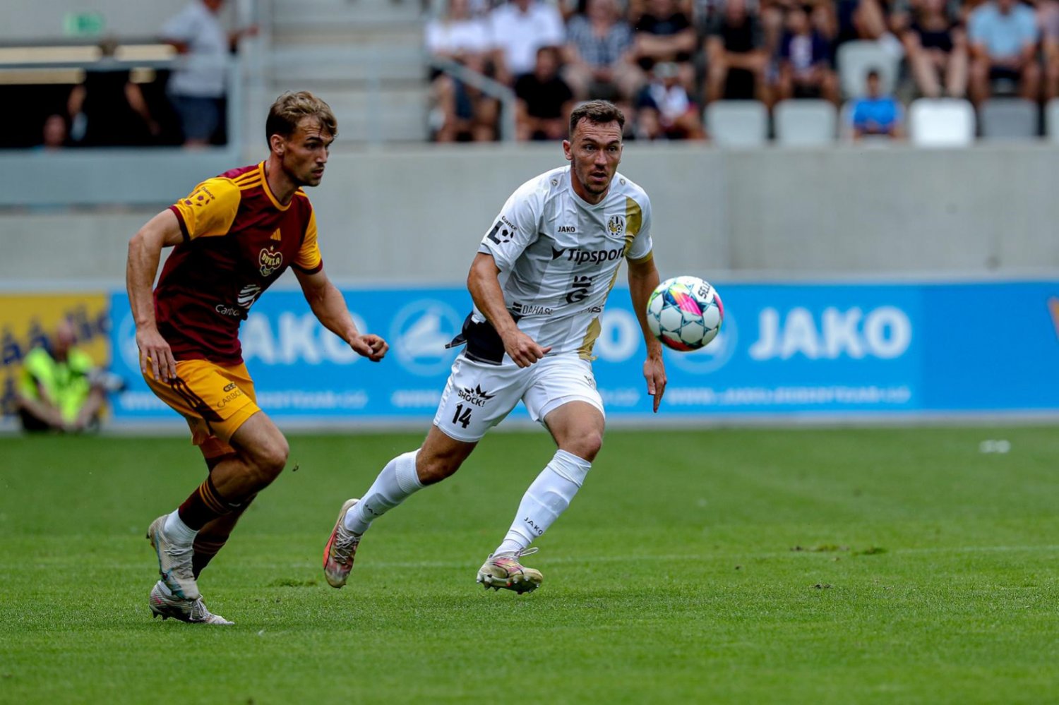 Ve 36. minutě poprvé výrazněji zahrozila Dukla, když střelu Lichého i následnou dorážku Šebrleho musel zneškodnit Čihák. Pražský celek ucítil, že se Východočeši nenacházejí v ideálním rozložení, nicméně se sérií centrů si černobílá obrana poradila. Už to vypadalo, že se do šaten půjde za bezbrankového stavu. V první minutě nastavení ale výborně vyvezl balón Čihák, před vápnem si hned se dvěma protihráči pohrál Vlkanova, čímž vytvořil prostor pro Horáka, jenž stříleným centrem našel zakončujícího Ondřeje Mihálika, který se proti Hruškovi nemýlil. Votroci se tak klasickým šatňákem dostali do vedení.